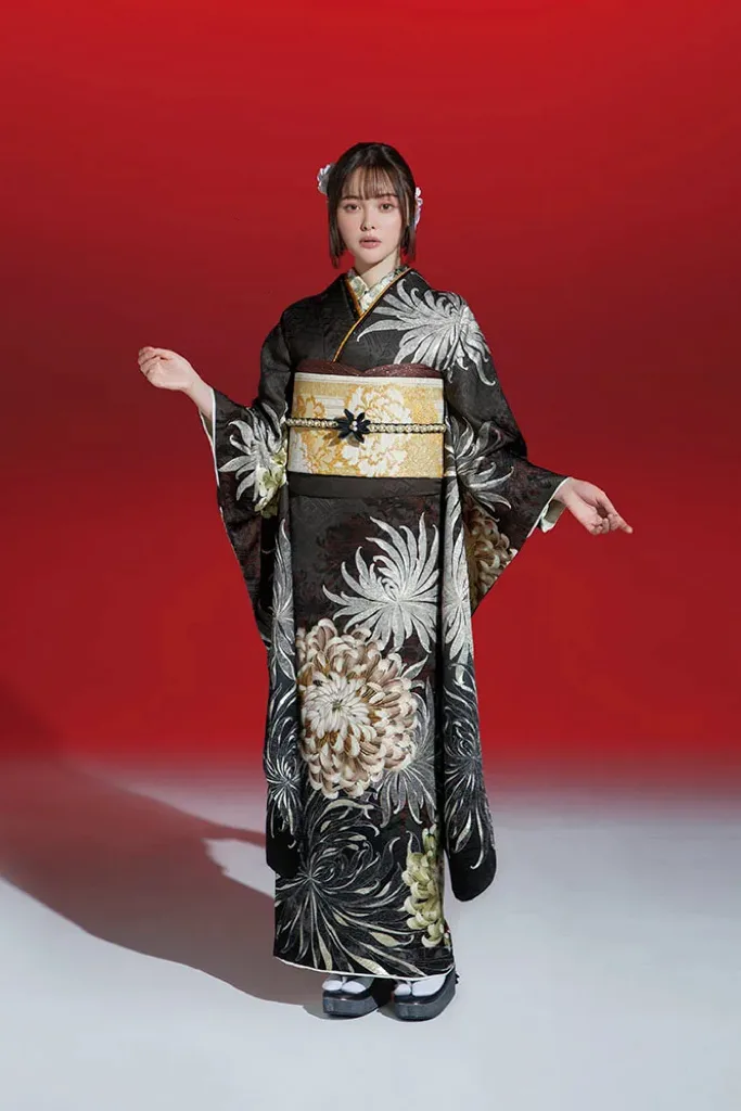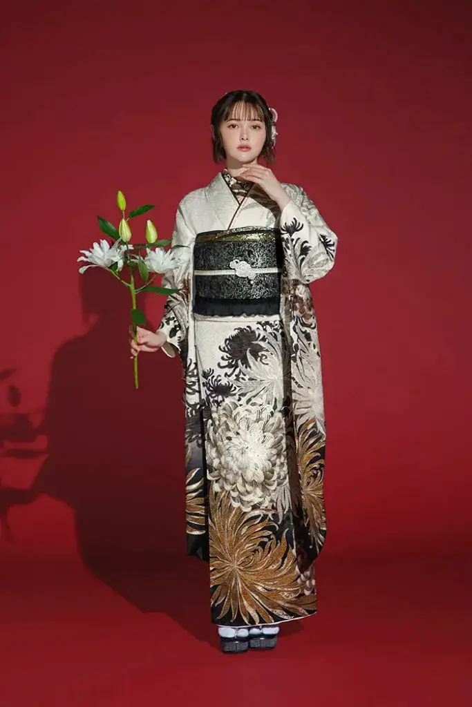 当店の最高級着物プラン。金糸銀糸を含む贅沢な色使い、艶のある上質の正絹生地、そして振袖によく似合う豪華な袋帯をご用意させていただきます。成人式前撮り、成人式当日、またはリベンジ成人式にぜひご利用ください!